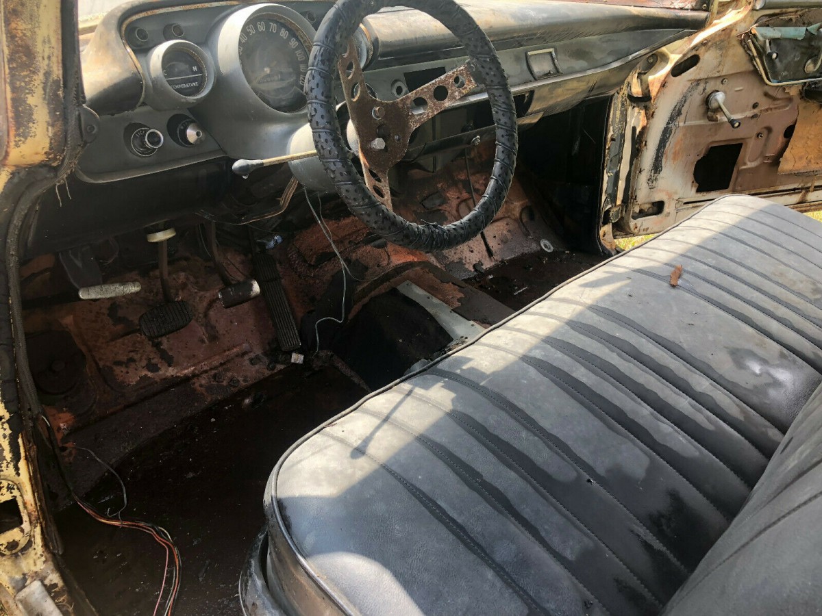 The seller claims this is a car that won’t nickel and dime you, due to the fact that it remains surprisingly complete. It may not look that way in this photo, but the little details are there, with the seller noting the radio and headliner bows are still present. The need for rust removal and patching is noted in the floors, front and rear, in seemingly isolated spots.