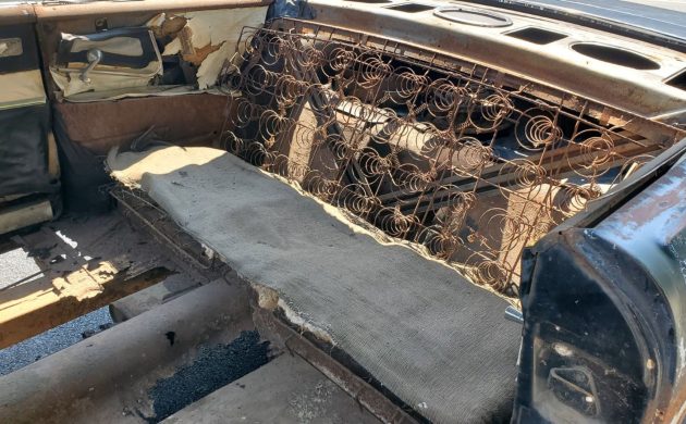 Now for the caveats: this is a rough car. The floor pans are essentially gone, the rockers are toast, and the passenger-side frame rail will need repair. That said, the seller believes the rest of the frame is salvageable, and there’s a decent amount of original trim included—most of the Sport Tone pieces, a front seat core, and a full set of Solex glass (minus the windshield). The desirable ribbed roof moldings are missing, but replacements do pop up from time to time.