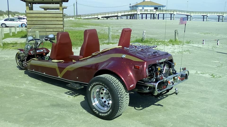 ( Three Seats In The Wind ) and it does run pretty quick it has a 1600cc Dual Port, Twin Carbs 4 Speed Stick and runs as smooth as a cloud it will light up those big tires and fly like a chicken chasing a june bug. The first picture was taken when I lived in Aransas Pass Texas but the pic was taken across the ship channel in Port Aransas on the north end of Mustang Island. It started out as a Tanner Trike built in California it was stretched and built by Brandon Johnsons grandfather up in Illinois, that’s where I bought it 15 yrs ago it is very safe to drive and more fun than you will ever know. I drove it almost every day every where it has been used in bike toy runs as Santa’s sled and I’ve used it as a limo down on Galveston Island for High school kids going to the Ball Dance on the Seawall Blvd. It blew everyone’s mind when we