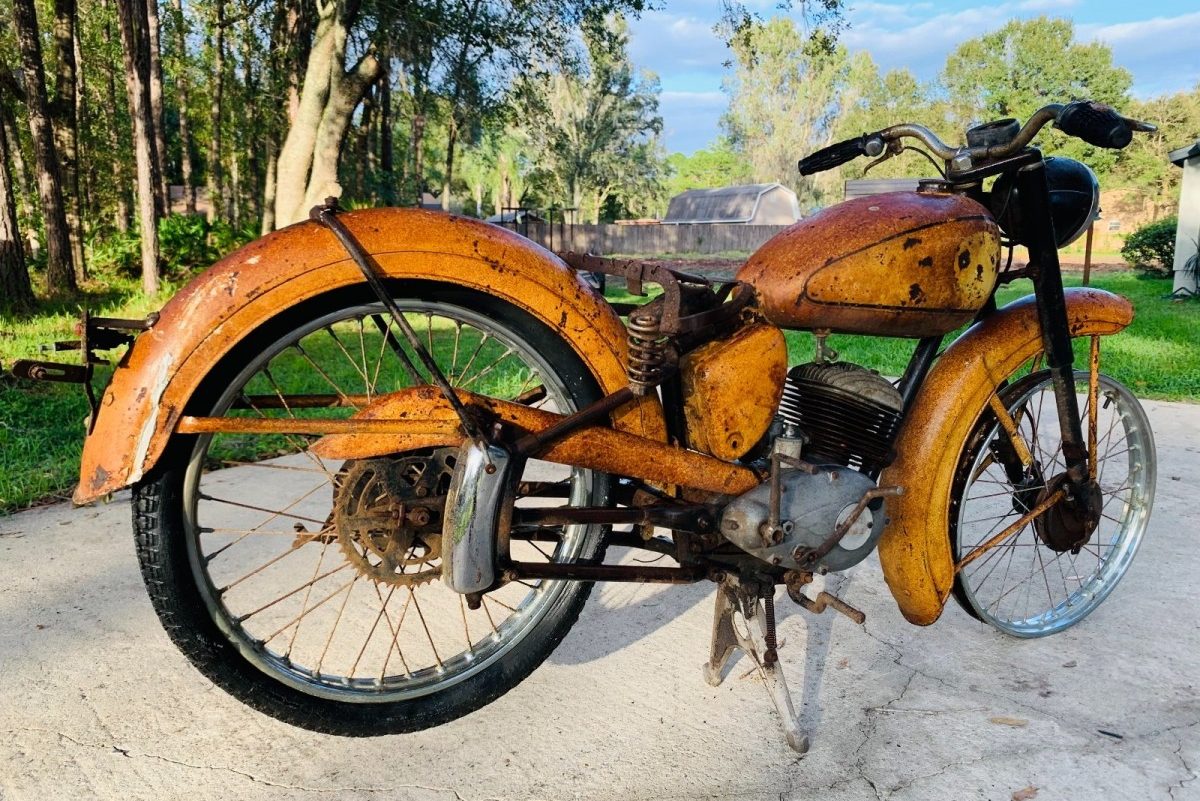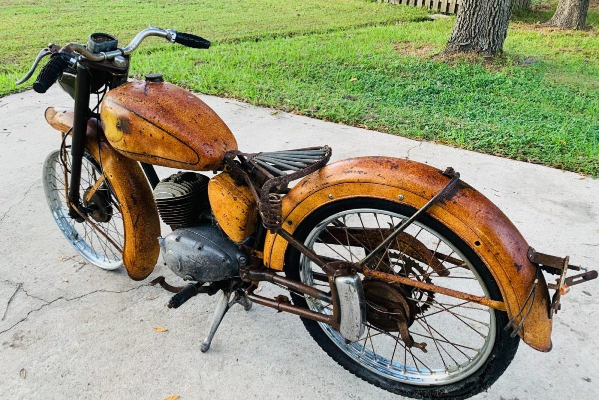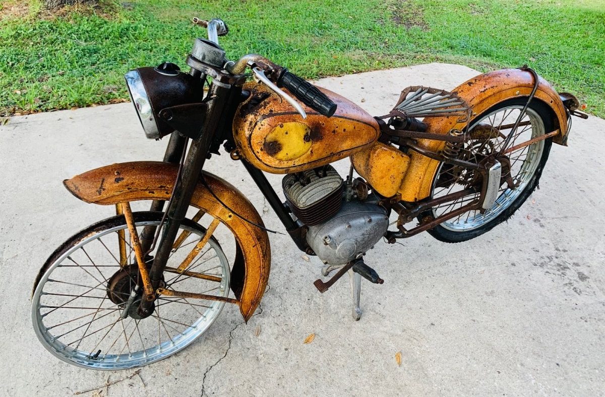 Hendee Manufacturing Company opened its factory in Springfield, Mass around 1901, George Hendee soon adding Oscar Hedstrom as a partner in making and selling motorcycles. They eventually renamed the company “Indian Motocycle (correctly spelled, no”r”) Manufacturing Company” in 1923. Their powerful machines were well accepted as civilian and law enforcement bikes. Popular models manufactured by Indian were the Scout (1,000 to 1,133 ccs, made from 1920 to 1946) and the Chief (1,811 ccs, made from 1922 to 1953). Indian developed a business relationship after WWII with Brockhorst Engineering of Great Britain, selling models both in Europe and in trying to expand sales in the U.S. Things just didn’t work out; John Brockhorst was brought in to try and salvage the Post-War poor performance of the brand. In 1950, under Brockhorst’s leadership, Indian brought a 247 cc Indian Brave Model to market on both sides of the pond. After valiant efforts with several other models (including one named “Papoose”), Indian Motocycle’s Springfield plant finally closed for good in 1953. As part of the liquidation process, Brockhorst wound up with the future rights to the Indian brand. Our subject machine, branded as an Indian, came out in the U.S. two years later having a 148 cc single-piston two-stroke engine pushing six hp through its three-speed gearbox and weighing just 183 pounds. It was capable of a screeching 4,750 RPMs. Seller of the subject Mark II has revealed that the engine is frozen unfortunately.