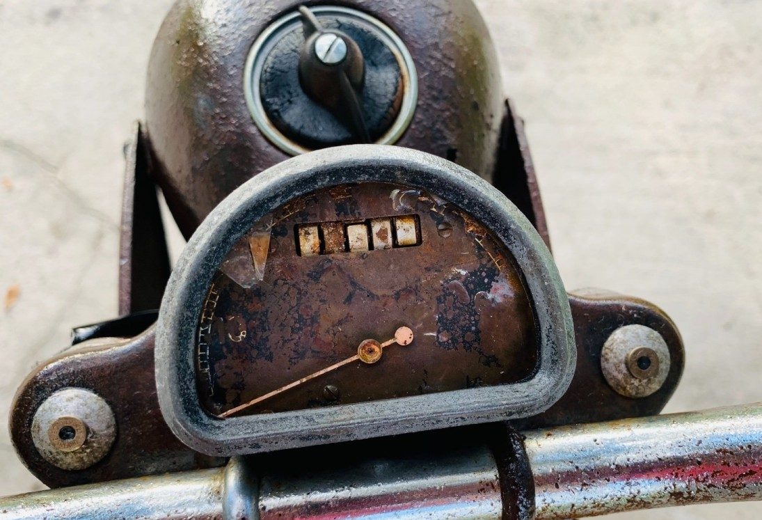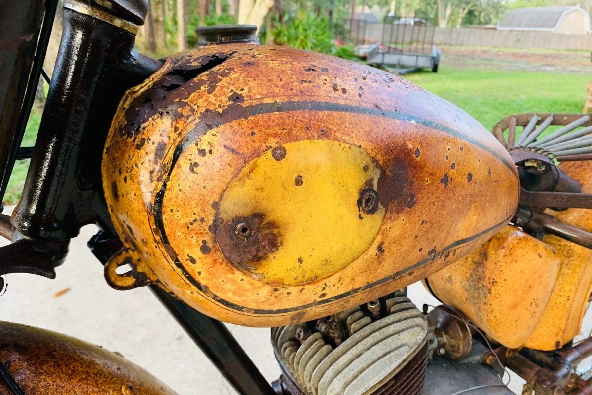 This photo shows the serious rot along the top of the gas tank and reveals a more material and pertinent issue: the chrome badges that should be found on both sides of the tank are missing. Oh-oh. With such a limited number of bikes made, are replacement parts non-existent? Where, for example, would NOS chrome emblems or a new gas tank be found? There may not be enough demand for re-manufactured parts. Replacement parts, then, are likely going to be handmade originals especially for the tank (really pricey-pricey) and the badges (also pricey-pricey) and probably most everything else. The buyer of this bike will need a 3-d printer, a metal lathe, a few engineers, imagination and both of Mom’s credit cards.