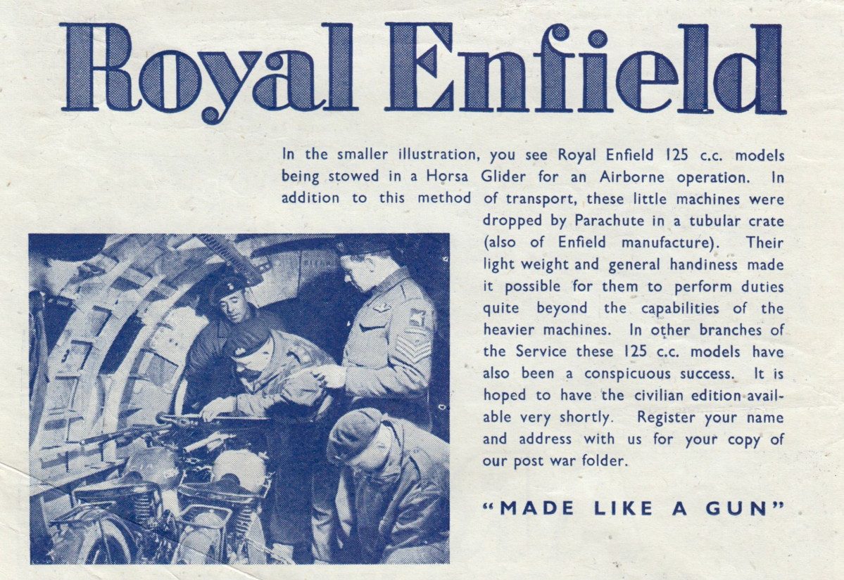. . .the speedo, odometer and switch area of the headlight bezel are seriously corroded and pitted. Hmm. While you’re thinking about sourcing spare parts–how, then, is this Indian Lance Mark II and the WWII hero, the “Flying Flea,” related? During the war, the Enfield Cycle Company in Worcestershire produced multiple Royal Enfield brand motorcycles for the British war effort. One particularly special motorcycle, a 125 cc two-stroke model dubbed the WD/RE was made for a variety of troops-on-the-ground requirements like reconnaissance, secret non-radio communications, troop transport, rescues, medical deliveries and the like. Enfield engineered the motorcycles and, after several failed efforts, finally developed a tubular crate where the cycle was able to be dropped to the ground by airplane or glider in one piece, bouncing like a flea on impact. Laugh as you may, more than 600 “Flying Fleas” were used on D-Day by the Third Infantry Division to help coordinate beach landings. We are collectively forever grateful for how that effort turned out. Below is a bit of war time news proudly discussing the Royal Enfield contribution to the war effort: