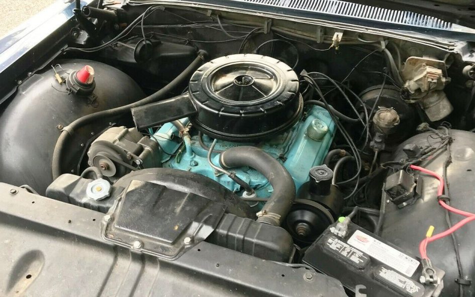 The Bonneville would have come standard with a four-barrel 389, but this two-barrel 389 came by default in the Catalina lineup including the Safari, according to brochure pages at lov2xlr8. Check out that nifty under-hood work light!