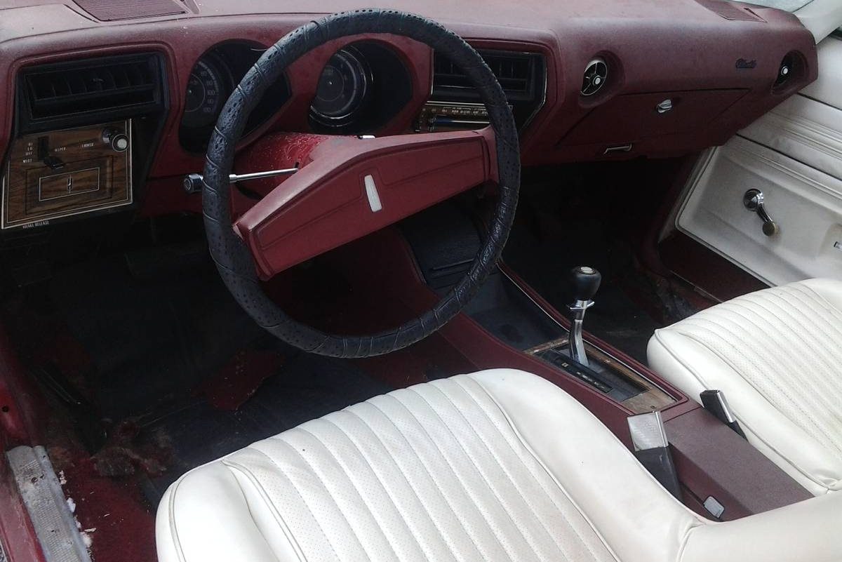 Unfortunately, under the cherry red paint and shiny white vinyl lurks rust, both in the floors and, more worryingly, in the frame. The car is, however, described as running and drivable, but more detail about its mechanical condition would be welcome. The Colonnade A-bodies are big, but were specifically designed to be good handlers, so with some rust remediation this could be a nice driver if all other systems are go—if not quite in the same vein as a 4-4-2 from a half-decade earlier.