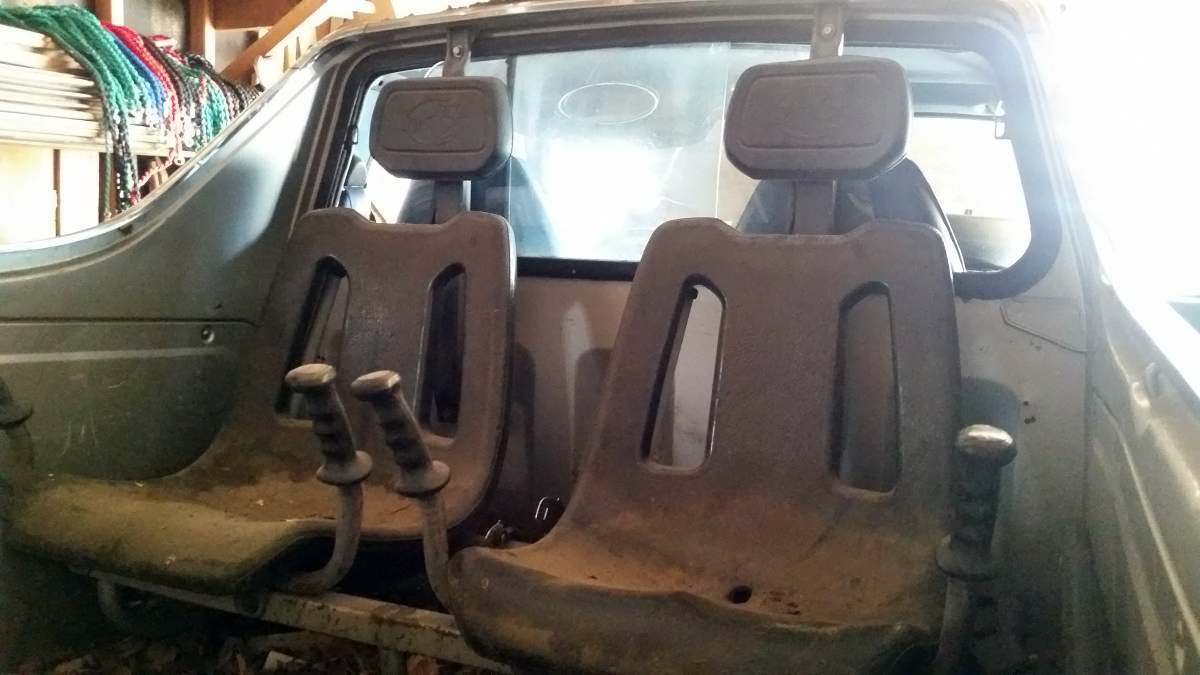 Pickup for “Cruise Nights.” We cut the floor out of an 84 Brat bed with a Harbor Freight battery powered sawzall in the local Pick ‘n Pull to get the frame and seats. I only install the seats when going out for a cruise, otherwise they are secure on a shelf in my garage, to protect them from sun, weather, and 2 legged coyotes…..
