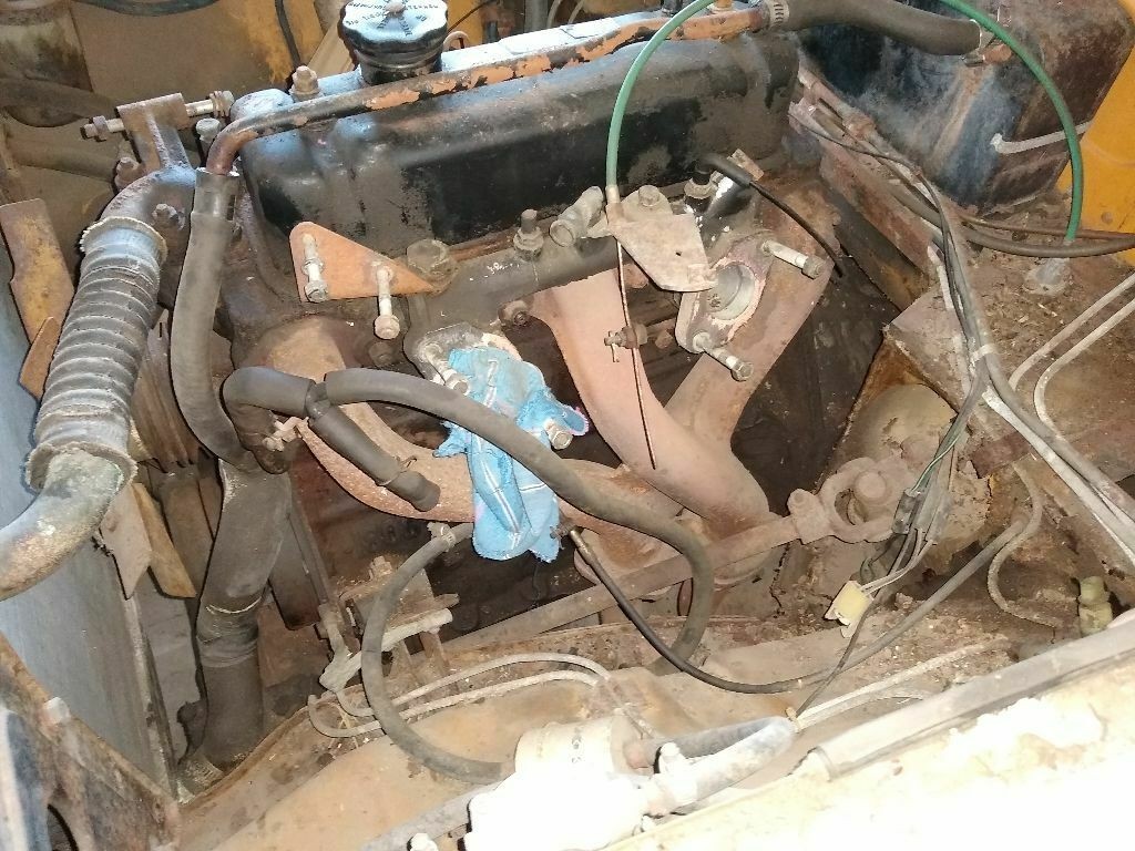 Under the hood, we see that the twin carburetors are missing and it looks like a glove was stuffed into one of the openings in the intake manifold. Also interesting is what looks to be a taped repair to the lower radiator hose. Was it an overheated engine rather than rust that sidelined this MGB so many years ago? Is that the reason a second engine was sourced? There are other concers as well. Look carefully in the lower right hand corner of the picture. Is that area rusted out or just very dirty?