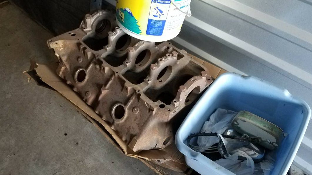 Here’s the engine, or at least the block. On the bright side, we can see it isn’t stuck or much else, actually. Can anyone tell from here whether it might be a 400?