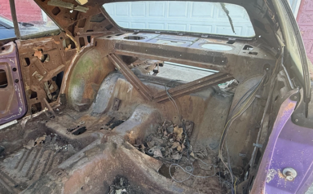 We don’t know the history of this Mopar, which would barely still be considered an automobile. The car had a black vinyl interior, the best color next to In Violet, except for maybe white. The drivetrain and related parts have long since taken flight. Without a front suspension, we wonder how the seller moves this thing around, if at all.