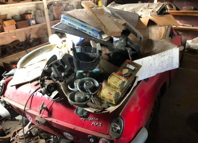 Other photos like this one reveal another indoor storage area, or at least one space that’s protecting a MK3 Spitfire, along with an impressive amount of junk piled on top. I have a feeling the seller has little or no connection to the stash of Spitfires, other than perhaps belonging to a deceased relative or land-clearing that involved getting rid of junk cars.