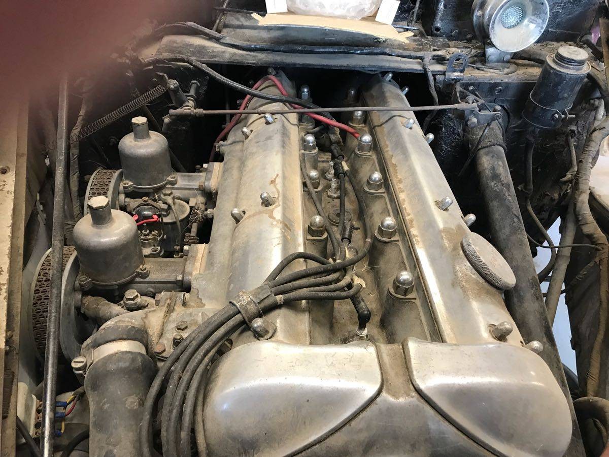 The XK engine in the car is a very early one having no studs at the front of the cam covers. Made before April 1952. Comes from a XK120 or MkVII. Looks very good with correct early carbs etc.