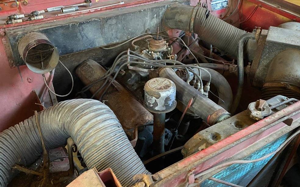 Talk about original, that’s what we have going on in the case of this very stock and weathered unit. This subject truck looks like a Scout 80 which was available between ’61 and ’65 – the what appears to be sliding side windows and the header-mounted windshield wipers (vacuum operated) give it away. The images aren’t too good so it’s hard to be definitive but the passenger-side is pretty banged up with a rusted-out lower quarter and rocker panel. There is also a smattering of dents and surface rust in various places. The seller admits the rust but claims that the frame is sound. This version of the Scout has a removable top and fold-down windshield.