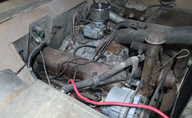 The interior is about what one would expect to find, austere and worn. It’s complete, and there’s no indication of rusted-through floor pans, so that’s a good start. The front seat has been covered with an Indian cover – a quick fix for shot upholstery, but it doesn’t really matter in the scheme of things. Assuming a full restoration, the interior would undergo a complete redo anyway, but I suppose the environment is functional and usable as is.