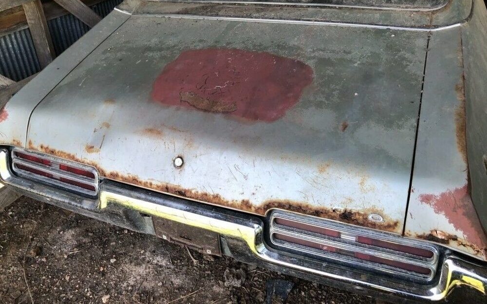The uh-oh happens with this example as you progress through the images and get to the one that features the engine and the missing front clip. There are a couple before that where a missing passenger-side fender has been removed but you get the full Monty at image #5. So, what happened? The seller states, “69 GTO, was clipped on passenger side 29 yrs ago, has frame damage on passenger side where radiator support goes. No damage to motor. Was bought new but was hit at 67,000 miles and parked over 30 yrs ago.” The confusing thing is the timeline, it’s only a year off but would seem to be reversed as in damaged 30 years ago and parked for twenty-nine in a barn. Whatever the case, that’s the story. He also adds that the 67K claimed miles is what the odometer read when this GTO was parked. The tachometer adorned hood is haphazardly positioned and a front fender, inner liner and the GTO Endura nosepiece are parked nearby in a pile. While not stated specifically, it’s doubtful that the body pieces are usable if they encountered a wack hard enough to cause frame damage. The hood may be an outlier, however. As for the rest of the body, it’s hard to tell what’s up, the dust and dirt are doing a pretty good camouflage job but it is possible to note what appears to be a dipped-in driver’s side quarter and a done-in (rust) trunk lid.