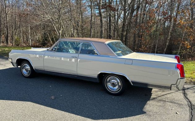 Oldsmobile’s Ninety-Eight set itself apart from lesser models through aesthetics, power (in some instances), and a three-inch longer wheelbase. Body styles included two-door hardtops and convertibles, along with four-door hardtops and sedans. One standout feature between the Custom Sports Coupe and the Holiday Sports Coupe is the former’s bucket seat and center console-adorned interior – and that was a surprise for me, as I assumed only models like the performance-oriented Starfire got the bucket seat treatment. Looking at production volumes, the Custom Sports Coupe generated 7,400 units while the Holiday Sports Coupe made do with less, yielding only 4,900 copies. The bucket seat interior on our subject car is not well photographed, but what can be spied looks good – almost too good to be original. Oldsmobile promotional material from the time claims a “Moroccan Leather” and fabric combination upholstery was employed in the Custom version of the Sports Coupe, but what’s there now looks more like a high-grade vinyl combination, as there’s no indication of leather creasing and cracking, something that invariably happens with age. Then again, it all could be original thanks to Oldsmobile’s use of high-quality materials and years of garage parking. The only other portion of the interior that’s really discernible is the carpet, and it shows as non-faded and like new.