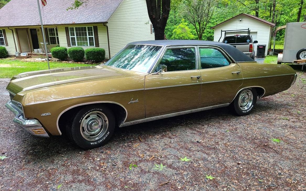 The one pictured has the 400 2 bbl small block, many of the 400 small block 70 Impalas came with a Turbo 400 transmission and 12 bolt rear end. I have its twin. Same Gold looking Factory Original exterior paint (not a repaint). Same Factory Original black vinyl top. 1970 Impala 4D Sedan but mine has the 350 2bbl 250HP Turbo 350 Trans. Same Original factory Rally 15″ X 7″ wheels that came with the car. GET THIS, 30K Actual original (never rolled over) miles!!!!. Mine has the original Gold Cloth bench seats. I would love to find someone to do a quality strato bucket / console update (like that one with the Monte Carlo swivel bucket option) and someone that could do a Functional Cowl Induction Hood update (by Frenching in Chevelle hood parts). That with Dual exhaust, a Holly 4BBL on an original Chevrolet Winters Foundry Snowflake LT1 intake (that I have) and some LT1 finned valve covers. All that and add the F41 suspension and it could be the 1970 Impala SS that NEVER WAS. If the Cowl Induction hood cant be done, I would be good with a GM Dual snorkel chrome hat 14″ air cleaner under the hood. FYI, I am in E. TN (incase there is someone that wants to volunteer to take on the project), With 30K on the clock that would be a fantastic SS Tribute.
