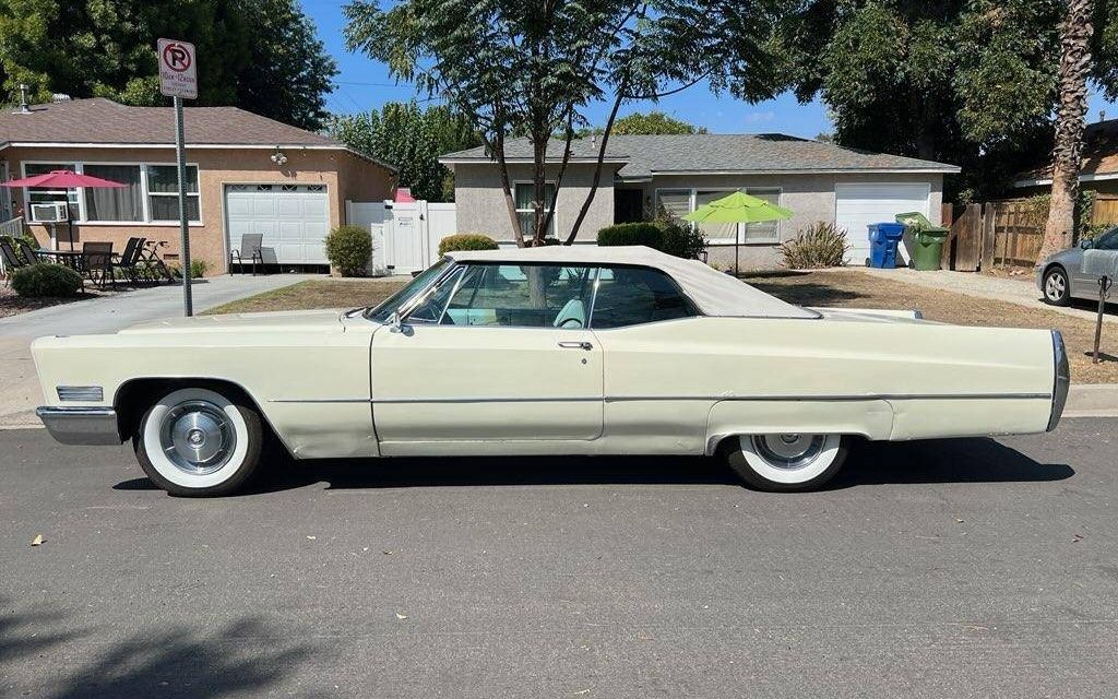 There is something wrong with the convertible top bows. The roof looks caved-in on the driver’s side photo. The “DeVille” script is also missing from the rear quarter panels. I would agree the interior looks original and in decent shape other than the discoloration. I hate the inappropriately wide whitewalls on this car.