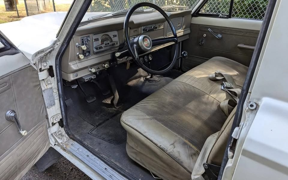 The interior looks original, with a grimy seat cover being the first item on the agenda for the new owner. Overall, this is an appropriately truck-like setting for a truck buyer of the 1960s, although times would soon require a more luxurious approach if you wanted to sell trucks. The ’70s brought about many trim upgrades from the Big Three.