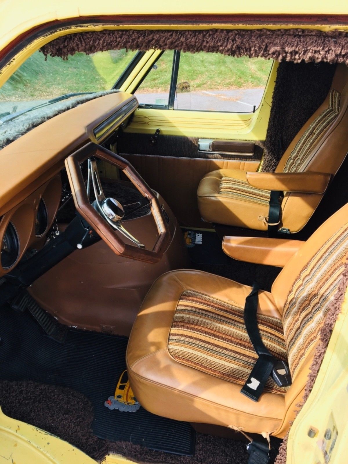 The Street Van was seen as a clever marketing idea by Dodge, but it never really caught on, and sales figures were actually quite low, so finding a nice example today can be quite difficult. This one is finished in the original yellow paint, which is said to be mostly original. There are a few marks and minor dings, but the overall condition of the body and paint is quite good. It still wears its original Street Van decals, and I believe that the wheels are also original. The exterior mirrors also look to be original, and these were fitted to the Street Van in place of the standard mirrors fitted to commercial vehicles.