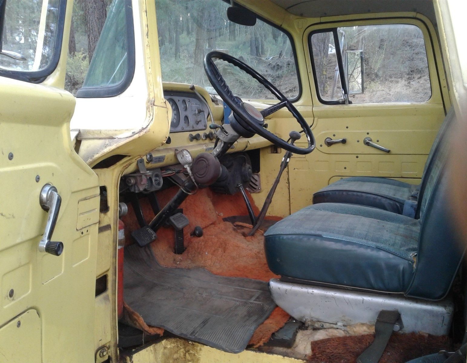 Inside is just what you’d expect from an old work truck, including the shag carpet. It looks ready to go to work. Those seats, or at least the upholstery, must be a later addition. There’s no sign of rodent occupation, but there’s also not much for creatures to chew on.