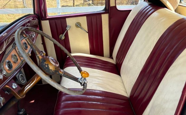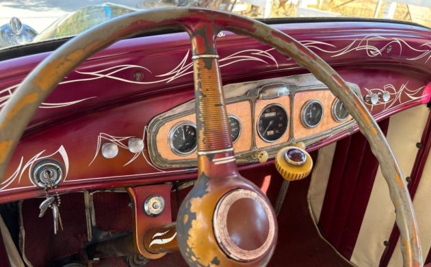 Looking through the pictures reveals many custom touches that were popular during the era in which this car was built. Perhaps the most interesting is the hand-painted striping seen in the picture above. Pinstriping is fast becoming a lost art, but it is fascinating to see the myriad of different stripes and just how many of them there were. The simple plastic steering wheel, the plastic bejeweled shift knob, and the tuck and roll vinyl upholstery are also a window into an era when the custom treatment could be both tasteful and outrageous. One other standout would be the dash of another old car, which has been inserted into the 1932 Ford sheet metal. Does anyone know which old car this was pulled from?