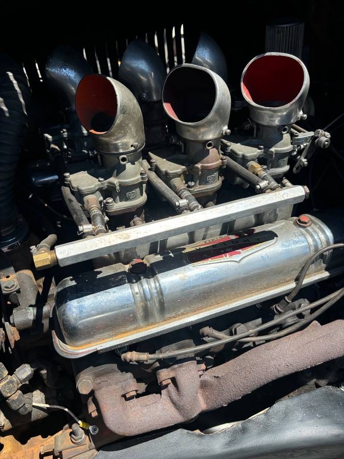 I think that’s two rows of Stromberg two- barrel carbs. While you can’t clearly see the rest, these three are perched nearly over the LH valve cover. Nice looking period-correct deuce.