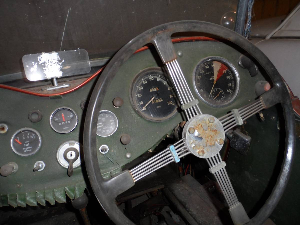 There’s really not a lot that can be said about the interior, as it is a mix of so many different components. The gauges are from a Jaguar, the dash is a TD item, the wheel is a Brooklands wheel. The whole thing looks quite shabby, and it really is in need of restoration. Still, I’d be pretty inclined to remove all of the non-Singer components and try to source a Singer body, interior, and trim if possible.