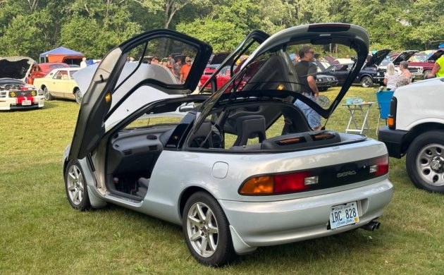 Imported Japanese cars often carry an air of mystery, but few are as striking as this 1993 Toyota Sera, now listed here on craigslist in Smithfield, Rhode Island. Built exclusively for the Japanese market, the Sera debuted as a concept at the 1988 Tokyo Motor Show and went into production with virtually no changes. While it shares its underpinnings with humble Toyota commuter cars like the Starlet and Tercel, the Sera’s futuristic styling—particularly its dramatic butterfly wing doors, makes it one of the most visually unique Toyotas ever built. This particular example has been well-traveled on the show circuit, with appearances at the 2023 Audrain Concours d’Elegance and display time at the Audrain Auto Museum in Newport, RI. It has even been featured in a YouTube segment with noted automotive historian Donald Osborne. Thanks for the tip Mitchell G.!