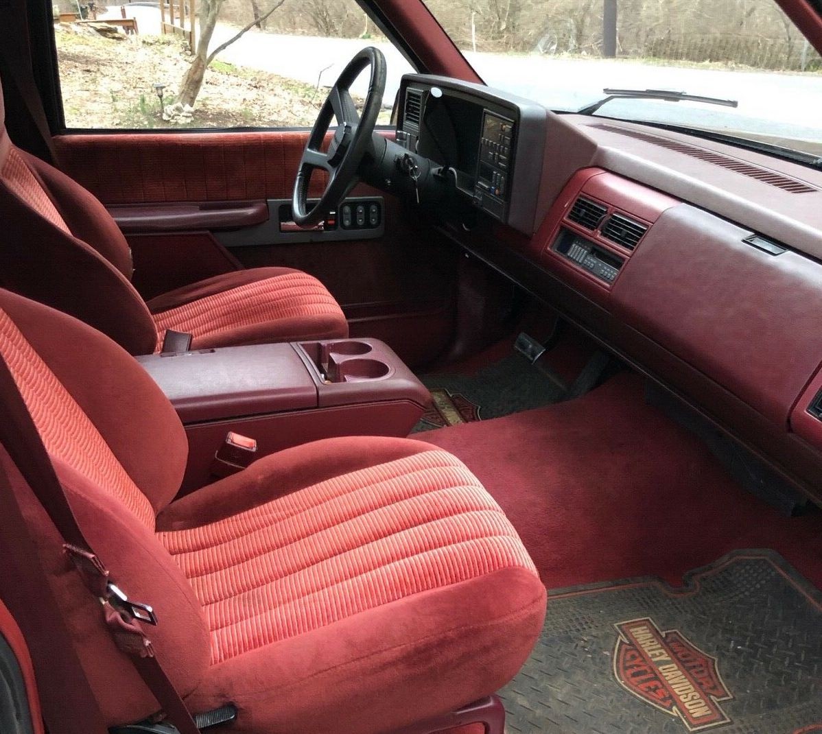 Inside the cab, you’ll find bucket seats that upholstered in Chevrolet’s lovely Garnet Red cloth. Quite frankly, the interior seems to be in good and original shape overall. However, the seller claims the cruise control needs a switch to work, and also that the headliner needs replacing, though no photos are shown. Last but not least, a new AC compressor was recently added to the truck, meaning that this cabin should be cool in the summers.