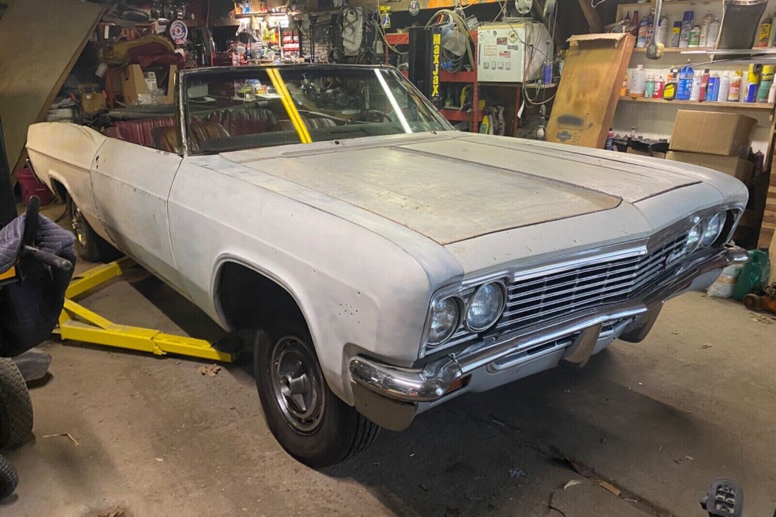 Hell YES! A sweet old ’66 Impala drop top. I’m willing to bet a good wet sand and buff will bring this car to presentable condition as it is. Then replace the top, work on the interior as time allows. I wouldn’t hesitate to decorate even a nice running 305/700r4 for almost free to just cruise on nice days and enjoy the countryside without a care in the world.