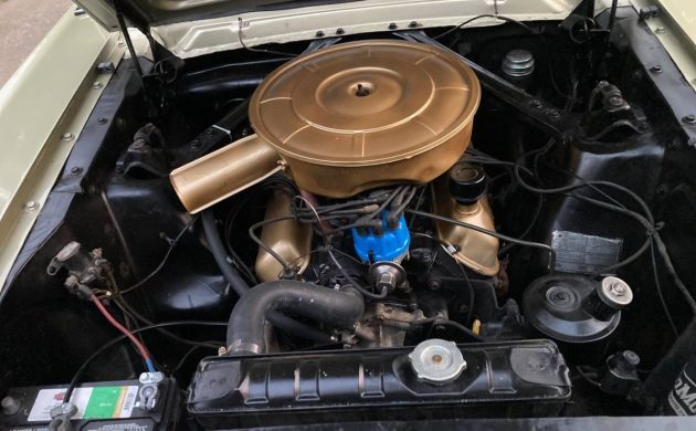 This is a rust-free unibody Mustang that was repainted a year ago in what may be the original color. At first thought, I surmised that it may be either Champagne Beige or Prairie Bronze, but the more I look at it, I’m going with the former. The interior matches nicely, and the front buckets have been redone and look like 1965 again (the carpeting is also new). So, from a cosmetic perspective, this Ford is ready to impress your friends and family. And how about those “spinner” wheel covers?