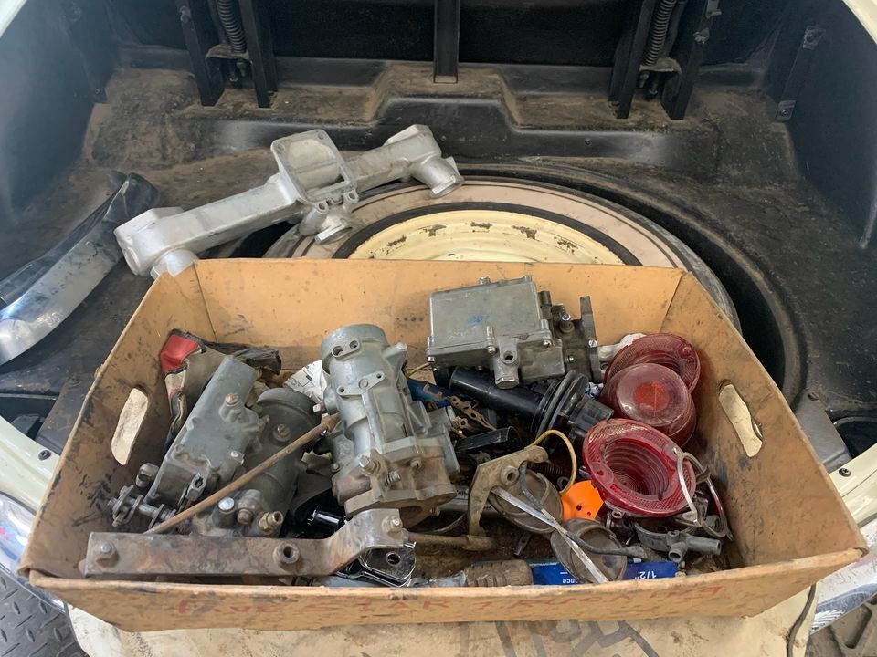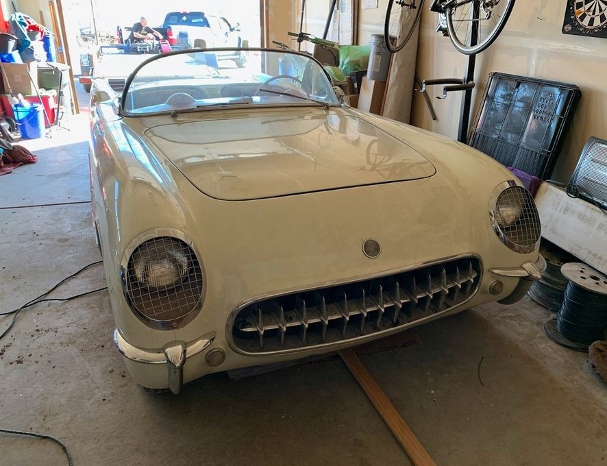 The seller’s 1954 Corvette looks complete, although there is a collection of parts in the trunk. We’re told it will run when hooked up to a secondary fuel source, which suggests that the everything between the gas tank and carburetor will need a good flushing out. The car seems to have been sitting idle for a while indoors, with at least one flat tire earned during that time. No accurate mileage estimate is offered, and the seller says the engine in the car is not it’s original.