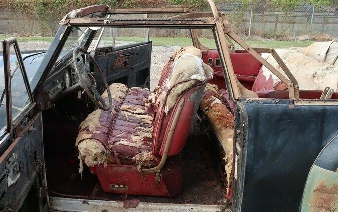 Claimed to be barn bound for 45 years, and as rare as it is, this cabriolet needs some work though the seller states, “THE BODY HAS NO RUST HOLES OR PATCH PANELS. THIS IS A SOLID CALIFORNIA CAR“. That said, it’s missing lots of obvious parts though some are available, and can be viewed, along with many other images, at Pete’s Classic Cars. The underside is revealing some notable scale but not anything that appears to be serious deconstruction. The folding top is listed as being power-assisted but the top frame is fabricless and the interior appears to have borne the brunt of being topless for so many years.