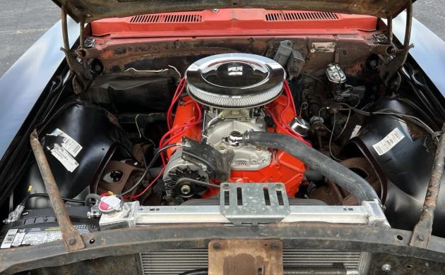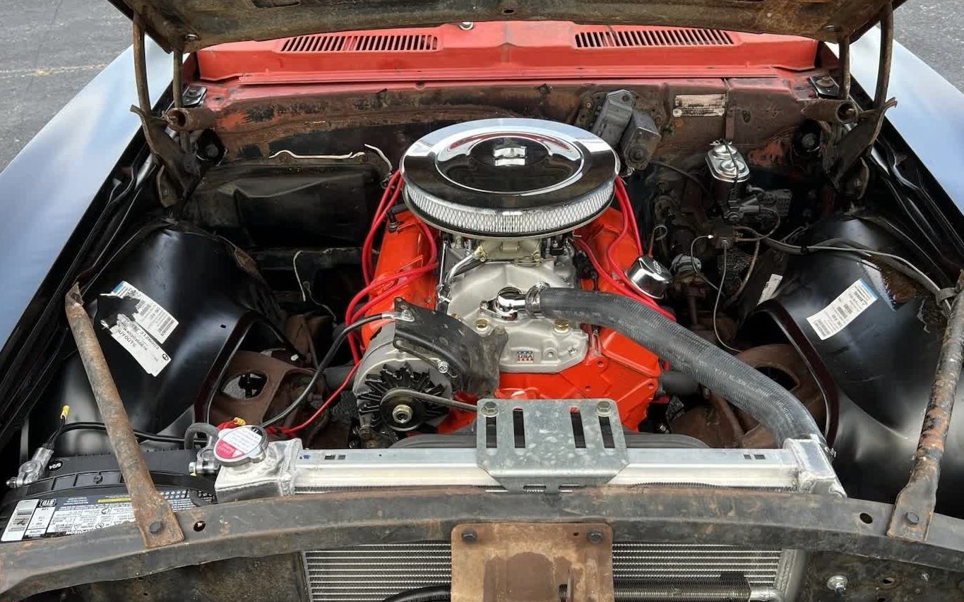 The listing describes a “rebuilt” TH350 three-speed automatic transmission, and we must assume the nondescript 400 cid (6.6L) small-block V8 got an aluminum intake and a “rattle-can rebuild” of bright orange paint. Chevy made 400 cid mills from both the big block and small block, the latter maligned for block weakness and overheating, according to NastyZ28.
