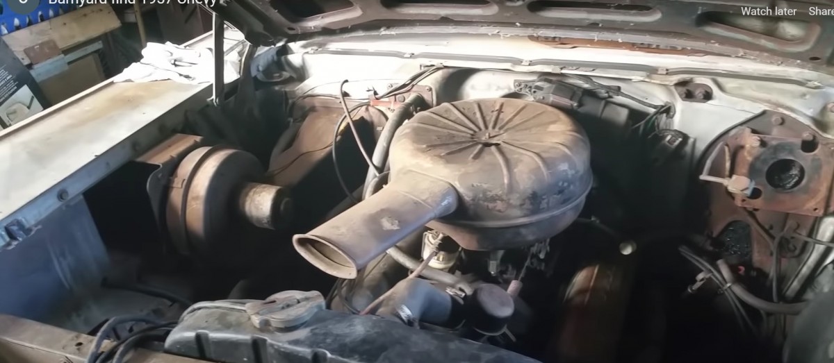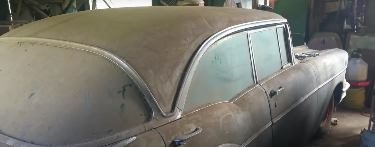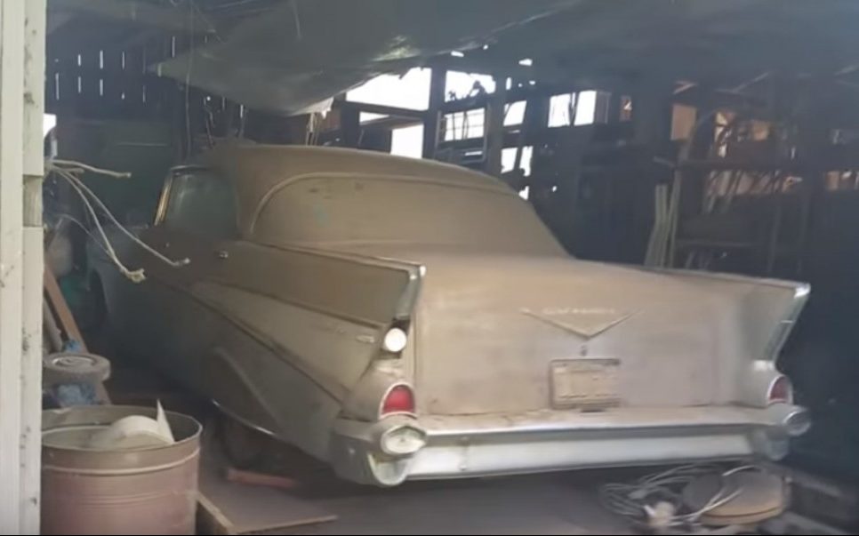 This old Bel Air is one of the famous Tri-Five Chevrolets that were built between 1955-57. Overall production for the three model runs was more than 4.5 million units, in 150/210/Bel Air trim. 1.56 million were built in 1957 alone, including this hardtop with four doors that would have been one of 142,500 assembled that year. Under all that dirt, it may still be in good condition, with what may have been two-tone paint at some point. The storyteller pops open the hood and reveals what appears to be a 265 cubic inch V8. We don’t get a peek at what the interior looks like after all this time.