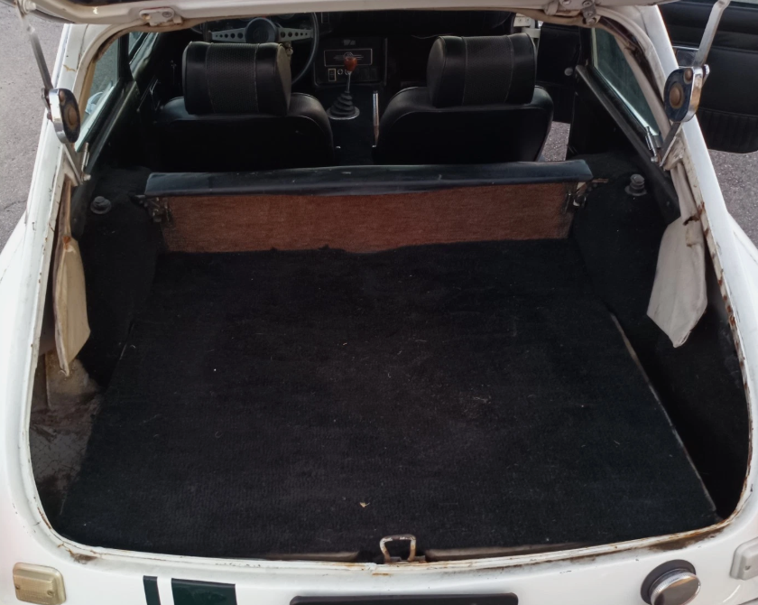The seller represents this car as a survivor, but it is not. No GT came from the factory with white-painted wires and a stripe. Speaking of the stripe, yes it’s hard to figure out how to angle it. Everyone has an opinion, but mine is that the stripe should have paralleled the driver’s side bonnet gap, or been centered. Laying out your design with pinstriping tape before applying paint affords an opportunity to debate the style for a while.