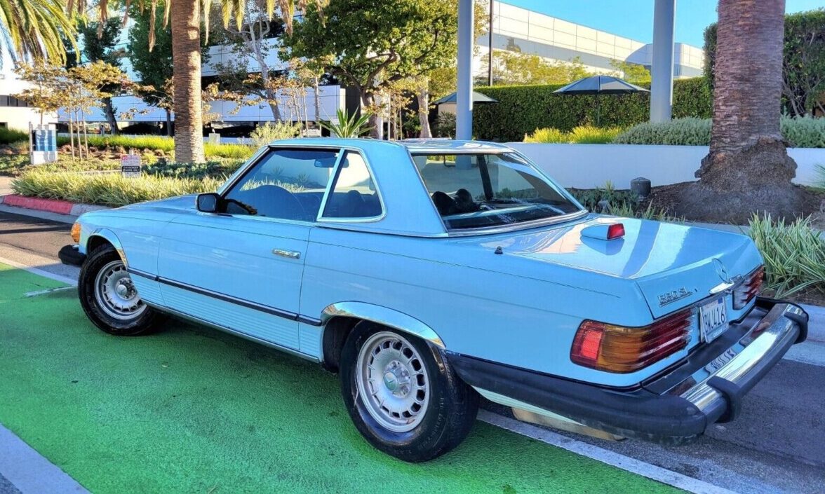 The thing about these cars is you can afford to be picky. This of course is not only in regards to condition but also qualities like color and options. The baby blue paint is a bit more uncommon than a black, white, or red SL, and the matching factory hard top is an added bonus. The Mercedes presents well down the sides with what looks like laser-straight body panels and unmarred U.S.-spec “safety” bumpers. The chrome fender liner is sometimes a cause for concern as they can hide rust, but I wouldn’t be too worried about it on this California car.
