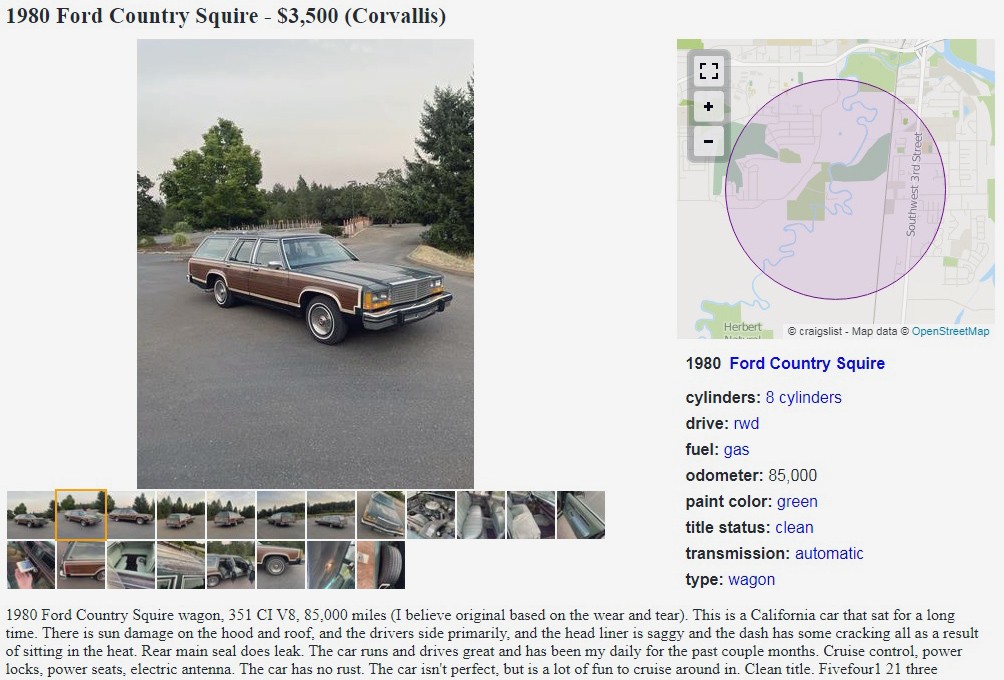 “Would you like woodgrain or no woodgrain, Squire?” That is the question, at least for Ford station wagon buyers in this era, and a few other companies that offered top-zoot micro-thin wallpaper-looking woodgrain on the sides of their long roofs. Make mine woodgrain, please, but you already knew that. This former California car, a 1980 Ford LTD Country Squire, is posted here on craigslist in Corvallis, Oregon, and they’re asking $3,500. Here is the original listing, and thanks to Curvette for the tip!