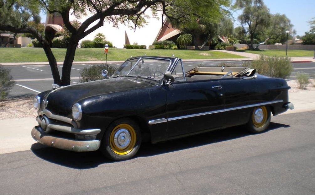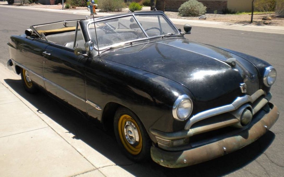 This unrestored original 1950 Ford convertible, located near Phoenix, AZ, is listed here on Craigslist for the reasonable price of $13,000. For a variety of reasons, Ford Motor Company wasn’t doing well financially in the late 1940’s. Some people have said that these are the cars that saved Ford Motor Company from demise. Debuting in 1949, this body style eliminated the dated fat fenders and running boards look of the previous models in favor of longer, lower, wider, slab sided styling which eventually earned these cars the nickname “Shoebox Fords”. The 1949/50/51 models may not have literally saved the company, but the much improved and modernized styling certainly brought Ford back to the forefront when they really needed a boost.