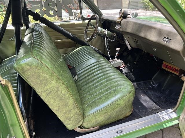 The cowl tag suggests the car was painted gold, to begin with, but we’re not sure. Both the exterior and interior are covered in either green or stickers or both. While the seller says there is a spot of rust in one of the rear quarter panels, the passenger side front fender seems to have a touch of it, too. The materials that were used to recover the seats aren’t close to anything that would have been stock. We’re told this Nova runs great, so would you buy this car to go racing again or take it in another direction?
