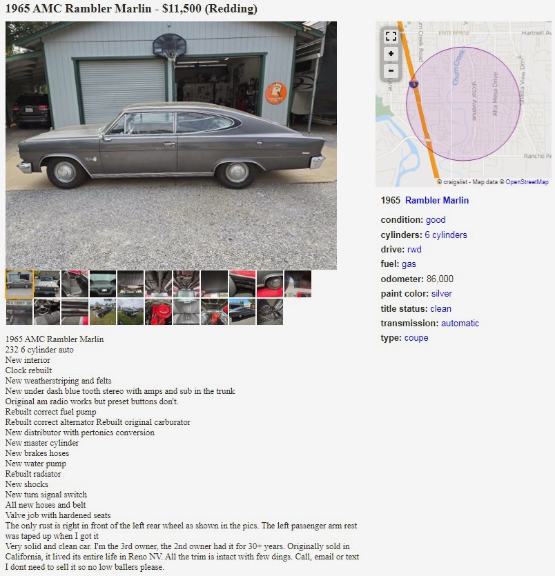 One of the most interesting and unique designs of the last 60 years, the Marlin of Rambler and AMC fame would almost always be a crowd-pleaser at car shows today. This nice-looking, first-year 1965 Rambler Marlin is posted here on craigslist in beautiful Redding, California, and the seller is asking $11,500. Here is the original listing, and thanks to Tony P. for the tip!