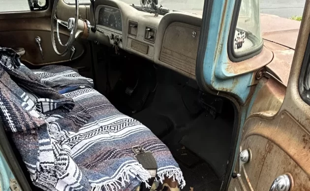 Inside, where it’s curiously patinaed too, we find a stock interior with a bench seat covered in an obligatory Mexican blanket. Beyond that, it looks like a worn, stock, 60-year-old pickup interior, complete with a rubber mat. It’s hard to say with certainty, but that blanket is probably there for more than just show. It’s an easy guess that the seating upholstery has gone kaput.