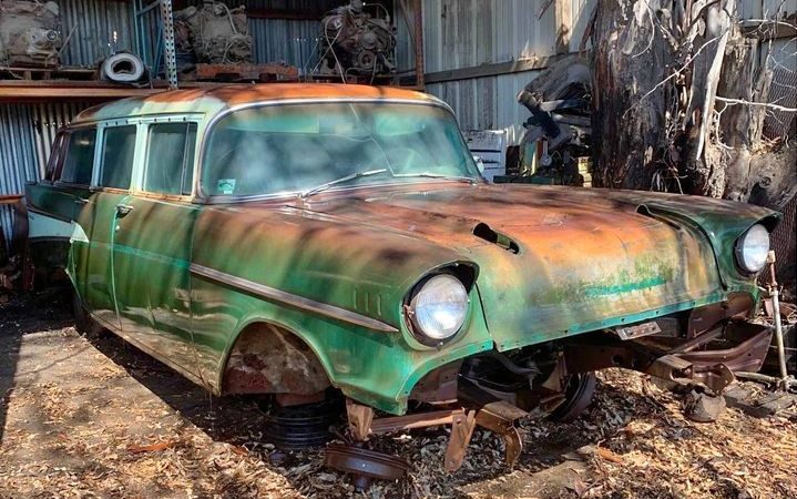 This 1957 Chevrolet wagon appears to be a stalled project. As you can see, most of the trim and brightwork have been removed at some point, but more about that later. It can be found here on Facebook Marketplace with an asking price of $6,500. Unfortunately, there isn’t a lot of information in the ad regarding the history of the car, but you can see heavy-duty racks in the background that are filled with engines. Located in Fontana, California, the paint appears to be sun-baked on the flat surfaces but looks fairly rust-free. Have a closer look for yourself.