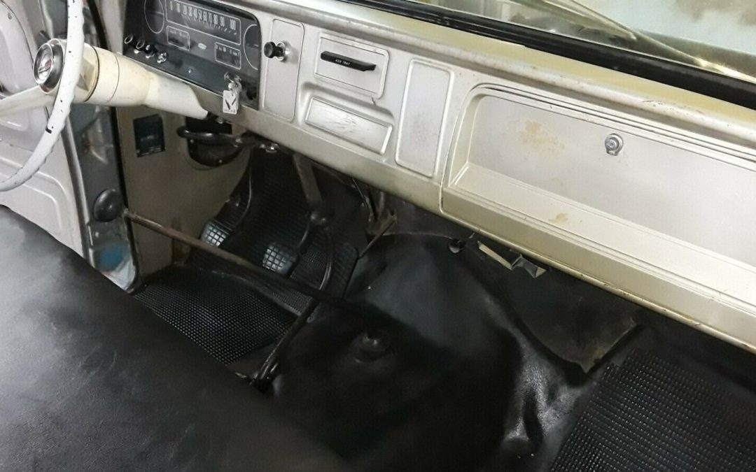 These trucks were built for work and you can tell the interior is no-frills. Metal dash, rubber flooring, and vinyl seat cover all serve a function. This truck is even more simple by having both the radio-delete and heater delete options! The seller says the interior is all original and all the gauges work along with the lights and signals.