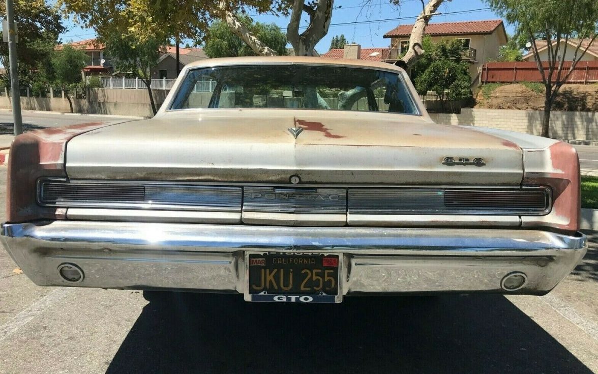 For ’64 and ’65, the GTO was an option package on the Lemans. In those model years, the car is technically a Lemans or Lemans Sport with the optional GTO package. In 1966 the GTO became its own model. I personally learned this the hard way when I passed up a good deal on a ’65 GTO after it came up as a Lemans Sport on the Title. I assumed it was a clone when if fact it was probably the real deal. This car has good documentation making it easy to verify, it was originally sold in La Crescenta, CA, and has the Pontiac Ident-O-Plate with the purchaser’s name. The Silvermist Gray paint is showing a lot of wear, I’m not sure if the red is primer showing through or if it’s been primed on spots.