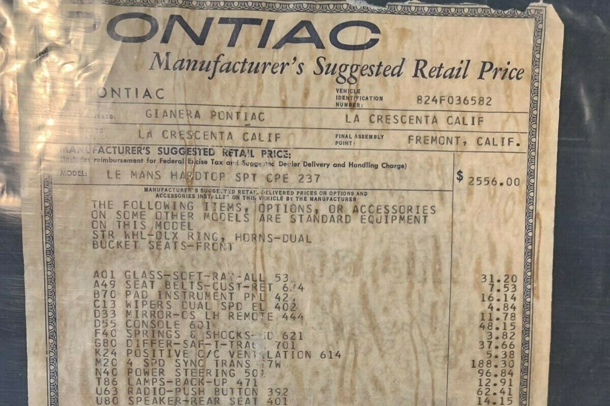 It’s amazing the window sticker has survived all these years, it goes to show the level of care the car has seen. Optional equipment in addition to the GTO package includes a 4 Speed M20 wide-ratio transmission, power steering, 3.23 ratio rear axle, and redline tires. The owner’s manual is still with the car and it comes with documentation from the Pontiac Historical Society.