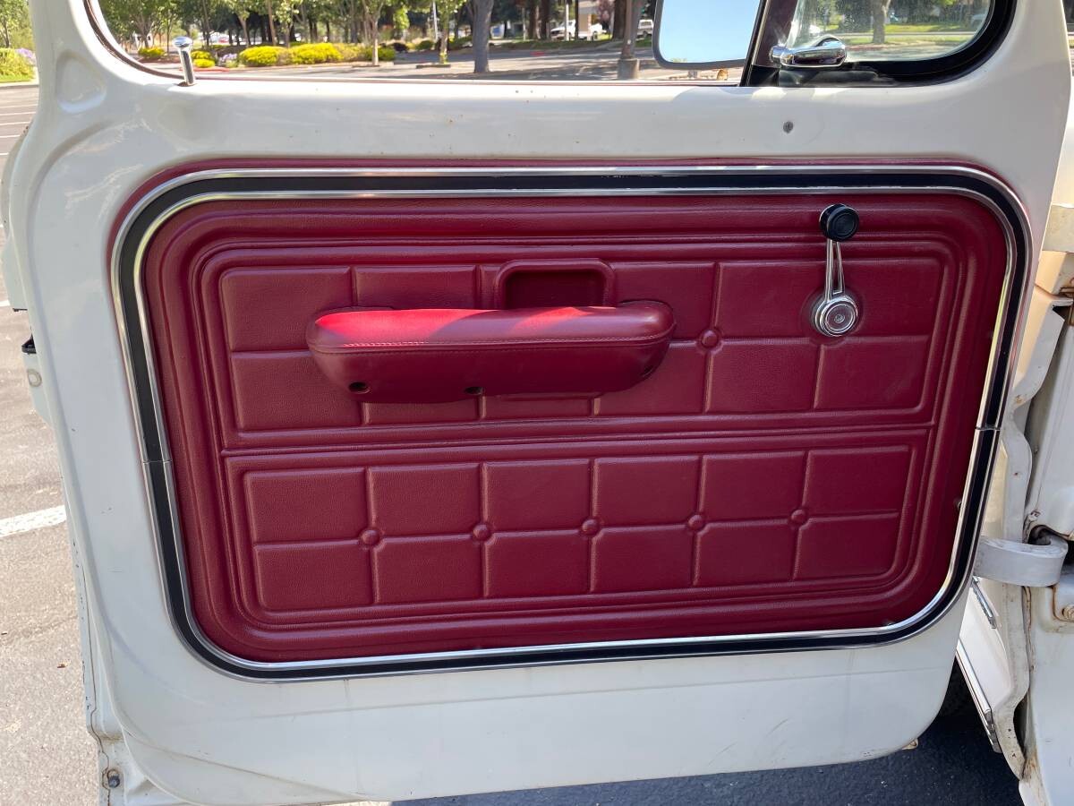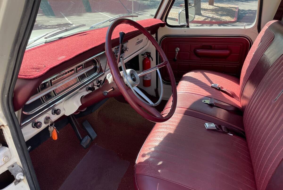 The F-250 has an attractive red and white late 60’s-era interior. The original red vinyl seat isn’t showing any rips or excessive wear, the red painted steering wheel and red carpet look good, and the door panels are in very clean, good condition.