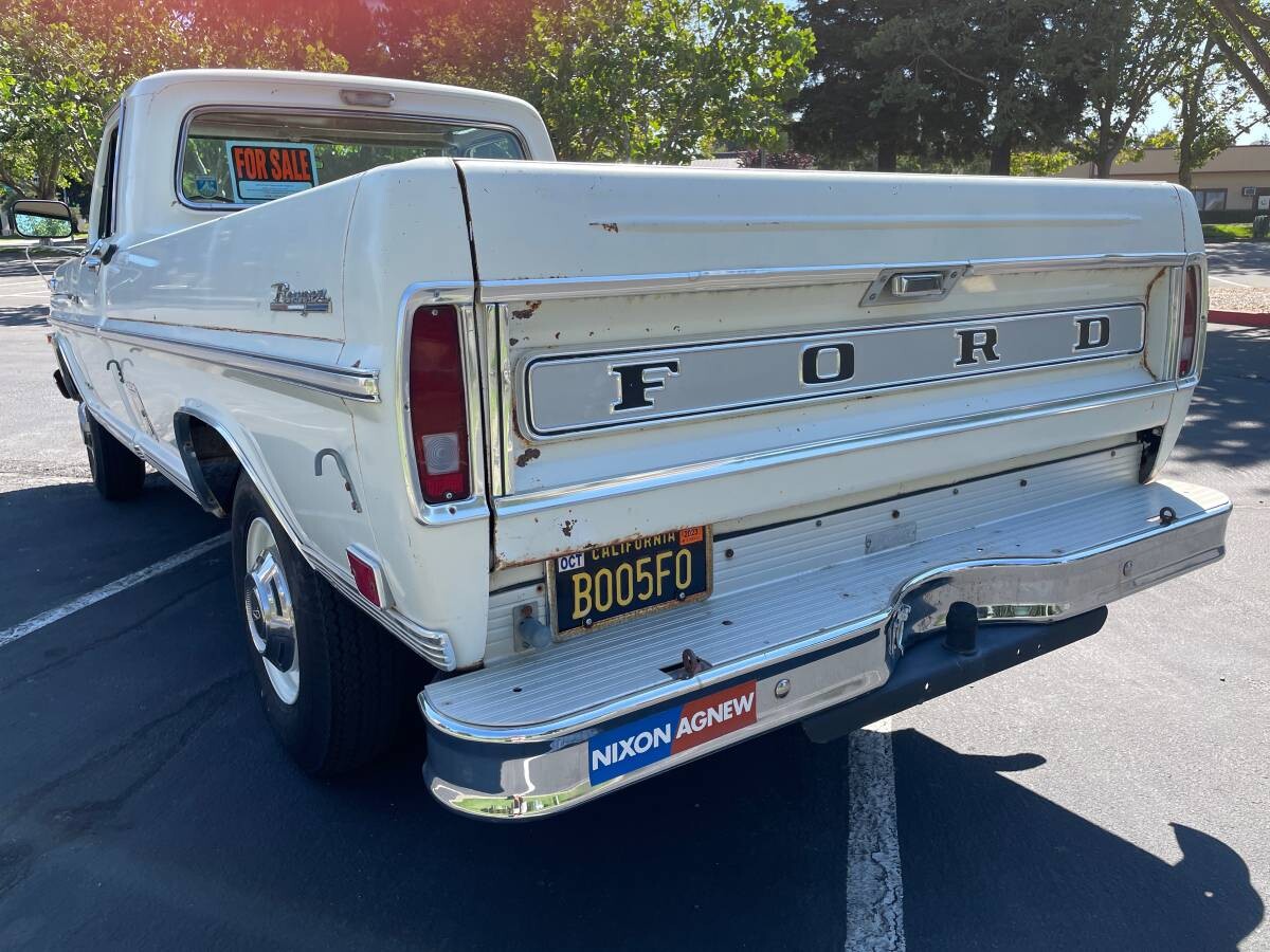 The current owner purchased the truck in 2015 from the second owner, who had it for about 30 years. Doing the math and the original owner would’ve had it for around 17 years before selling it in 1985. The current owner admits the truck has been doing its fair share of sitting since only about 1,000 miles have been put on the Ford since 2015. Based on the photos, the body looks solid with just a few small rust spots visible on the tailgate and below the passenger side taillight. The original Wimbledon White factory paint still presents well and it has some chips and a few small bumps and bruises, and the bed had black bed liner spray applied to it decades ago. The original glass looks good as does the chrome, body side molding trim, badging, and lenses. The Barden rear bumper is an aftermarket addition and sports a Nixon/Agnew ’68 bumper sticker.