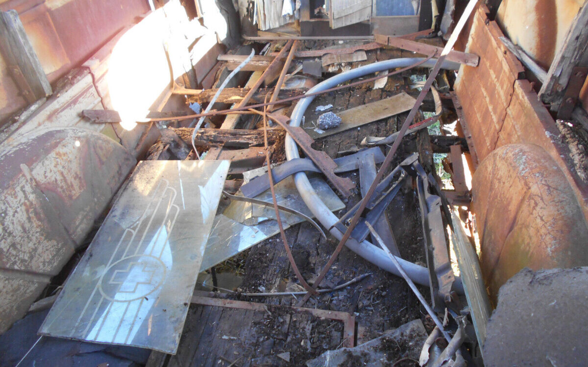 As for the interior, it’s pretty well destroyed, the only item of interest being that frosted pane of glass left over from its service days. It’s a gutted, rusted and trashed environment.