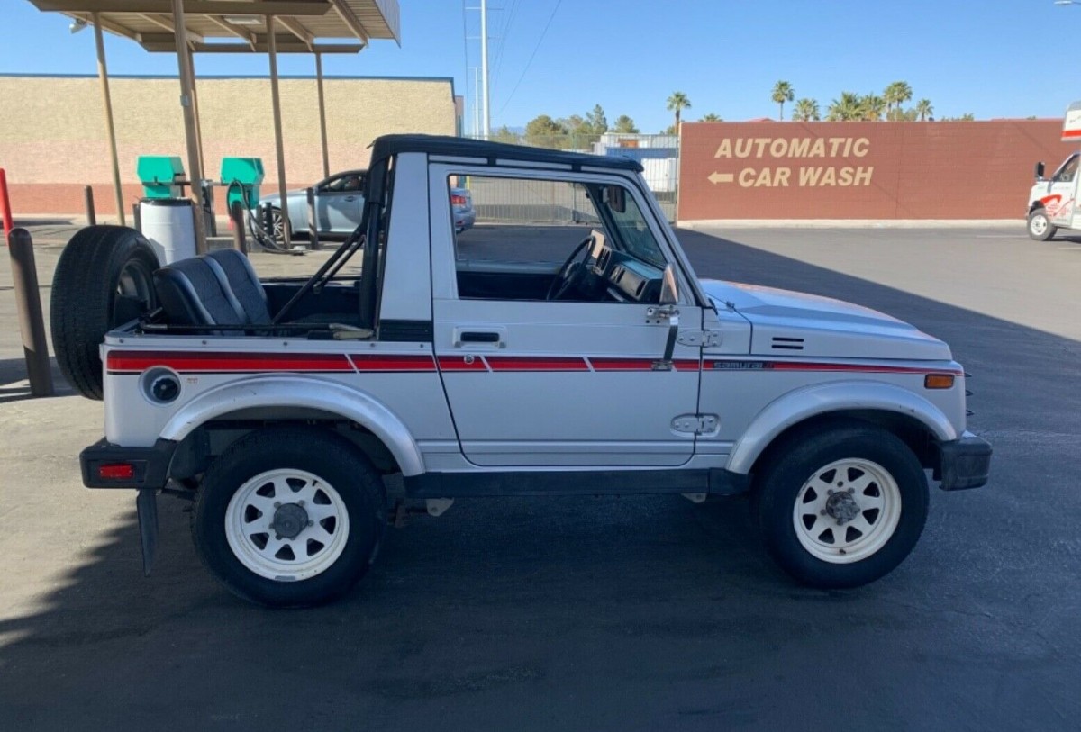 While we don’t know how long this ’87 Samurai JX has been owned by the seller, it’s said to have mostly seen the back of a motorhome for the past 34 years. That means its mileage doesn’t reflect how much time the engine was required to make the wheels turn. The seller says it’s in pristine condition with only a nick here and there to prevent perfection. We’re told if you go looking for rust on this Japanese Jeep, you won’t find any. It doesn’t have a hardtop, but a full tub bikini instead. The Suzuki is still sporting its original paint and striping, which came with the JX package. It comes with a front tow bar in case you have your own RV.