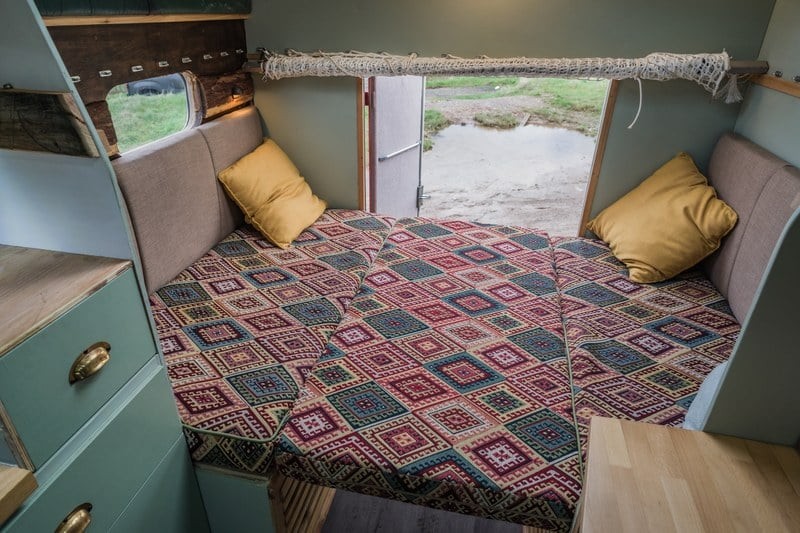 I have infinite respect for builds like these, but the price tag always seems eye-watering (and yes, I realize if you’re handy, you can do this yourself, but that represents months of time and loads of lost weekends – no thank you.) This is where true ingenuity kicks in, as you will have to perform some deconstruction of the original layout to get a setup like this installed. Featuring custom countertops, a backsplash, and appliances including a sink and fridge, this Mercedes mobile home has everything you could want for life on the road. The listing notes the builder used Canadian Cedar throughout the interior.